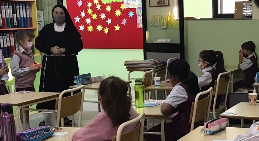 Sr M. Grace Mercieca and Sr M. Pierdamiana Moran went into all the primary and secondary classrooms and said a decade with the students and members of staff. Students and members of staff were guided to reflect on the sufferings of children and people around the world and to offer their intentions to grace those who are suffering.